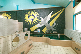 JR三鷹駅南口周辺のマンション1Fにある銭湯です。イタリア製のタイルを使用した浴場が売りです。