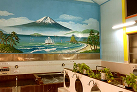 池袋・椎名町・要町界隈 立教大学至近の銭湯です。竹を配した岩風呂や男女異なる 河をイメージしたタイル壁画が特徴です。