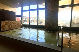 露天風呂の源泉かけ流し湯、室内風呂の温泉50%ぬる湯で使用)。観葉植物と共に海風に当たって入浴できる露天風呂は都会に居ることを忘れさせます。入館料